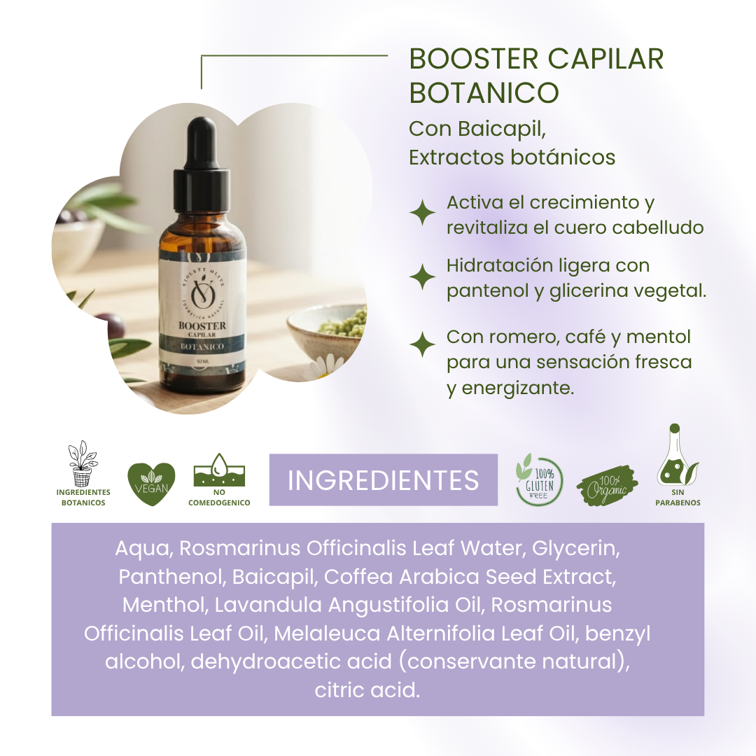 El Booster Capilar Botánico Violett Olive es un tratamiento natural diseñado para estimular el crecimiento del cabello y fortalecerlo desde la raíz. Su fórmula combina el poder del hidrolato de romero, el extracto de café, el Baicapil y el pantenol, logrando un equilibrio perfecto entre eficacia y suavidad.