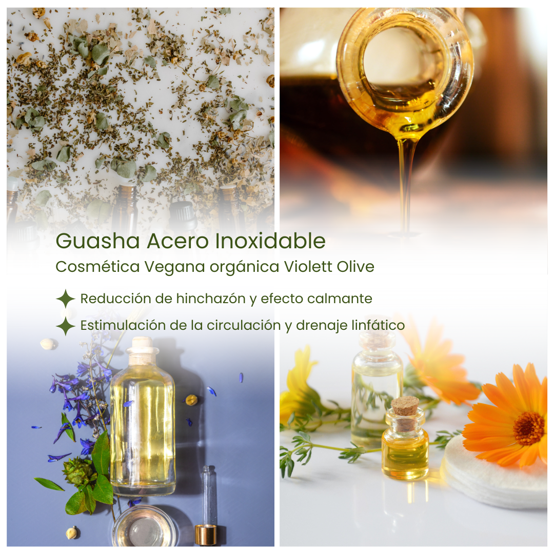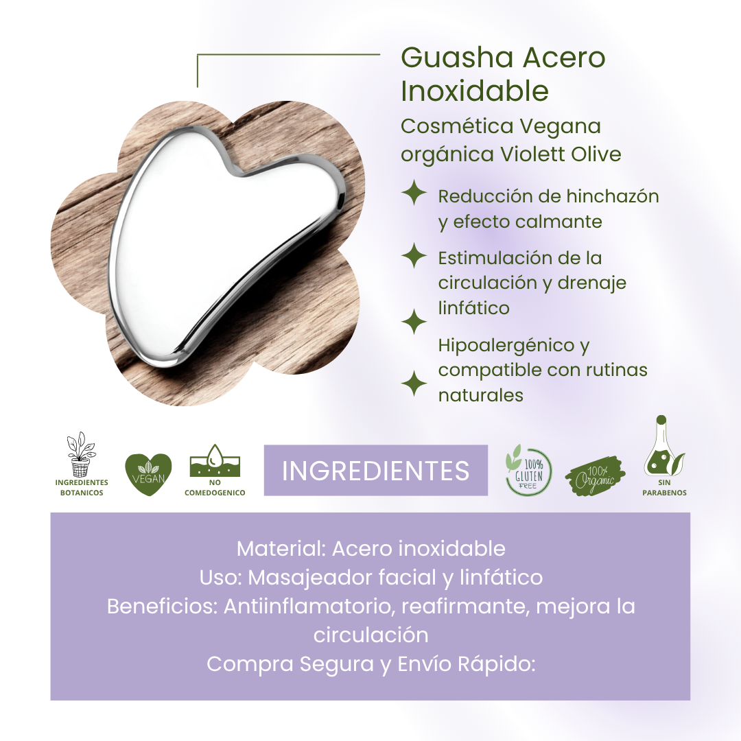 guasha acero inoxidable para piel sensible, herramienta masaje facial hipoalergénica acero inoxidable, guasha vegana orgánica Violett Olive, masaje linfático rostro piel alérgica, guasha acero inoxidable cosmética natural vegana, masaje facial suave para piel con dermatitis, guasha acero inoxidable efecto frío piel reactiva, rutina facial botánica para piel sensible guasha, guasha acero inoxidable drenaje linfático rostro, guasha acero inoxidable cuidado de piel alérgica.